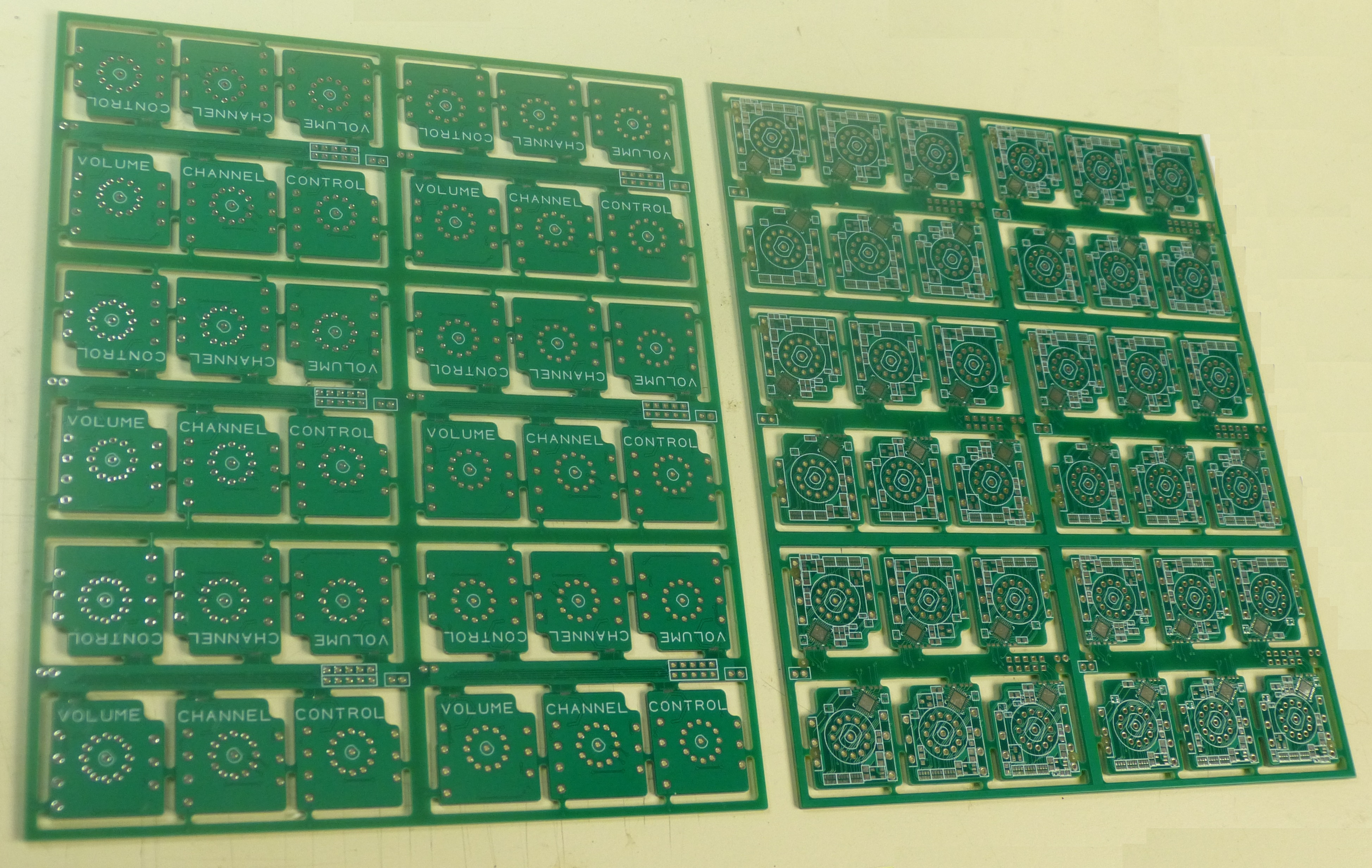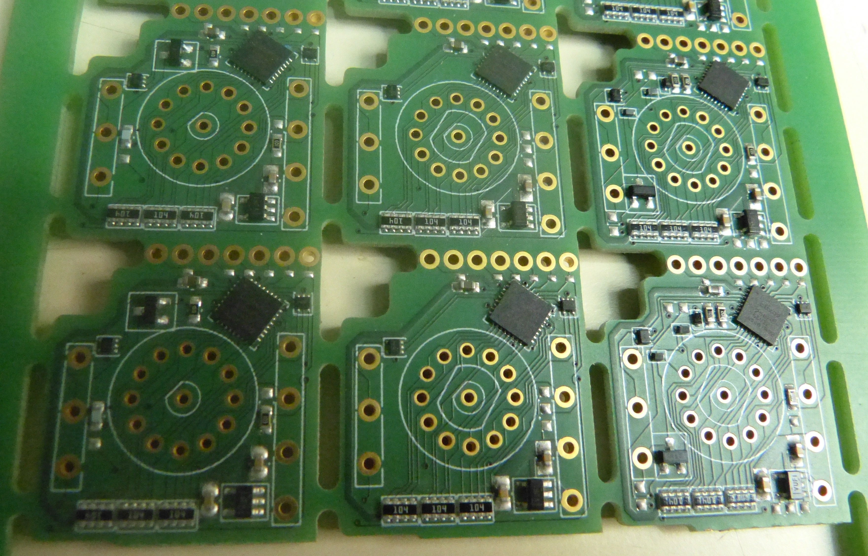 You can click on the images below to enlarge them. They show an both sides of an unpopulated PCB substrate and a set of boards populated with their surface mount components.